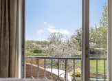 De badkamer etaleert luxe en comfort. Je hebt de beschikking over een whirlpoolbad, een ruime inloopdouche, een tweepersoonswastafel en, achter het muurtje, is het toilet. Stucwerk is gecombineerd met fraaie tegels en mooie kranen.