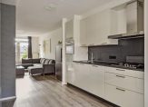 In de keuken staat een hoogglans wandopstelling met brede lades, onder- en bovenkasten en een fraai aanrechtblad met achterwand. De gaskookplaat, afzuigkap, vaatwasser, koelkast en combi-magnetron zijn ingebouwd. Met een drankje is het een paar stappen naar de bank en ook voor het eten hoef je niet ver te lopen naar de eettafel. In de hoek hangt een airco-unit, die voor verkoeling en verwarming zorgt.