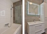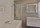 De moderne badkamer is fraai ingedeeld met een ligbad/douchecombinatie, een wastafelmeubel, hoge wandkast en een grote spiegel met verlichting. Ook de wasmachine en droger kunnen in de badkamer staan.