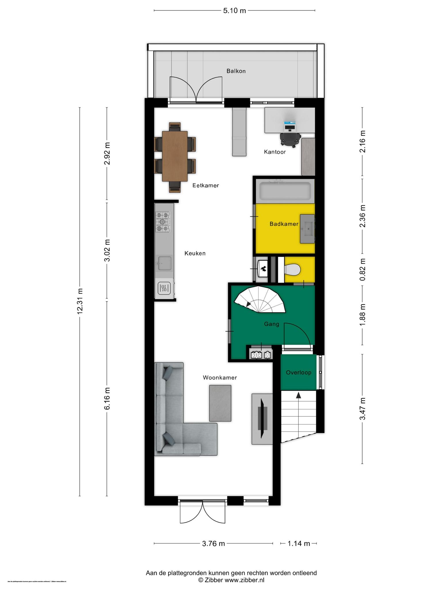 In de hal zie je de wenteltrap naar de tweede verdieping, een mooie PVC-vloer en de meterkast. Recht voor je is de toiletruimte, ingedeeld met een wandcloset en grote wand-/vloertegels in rustige kleuren.