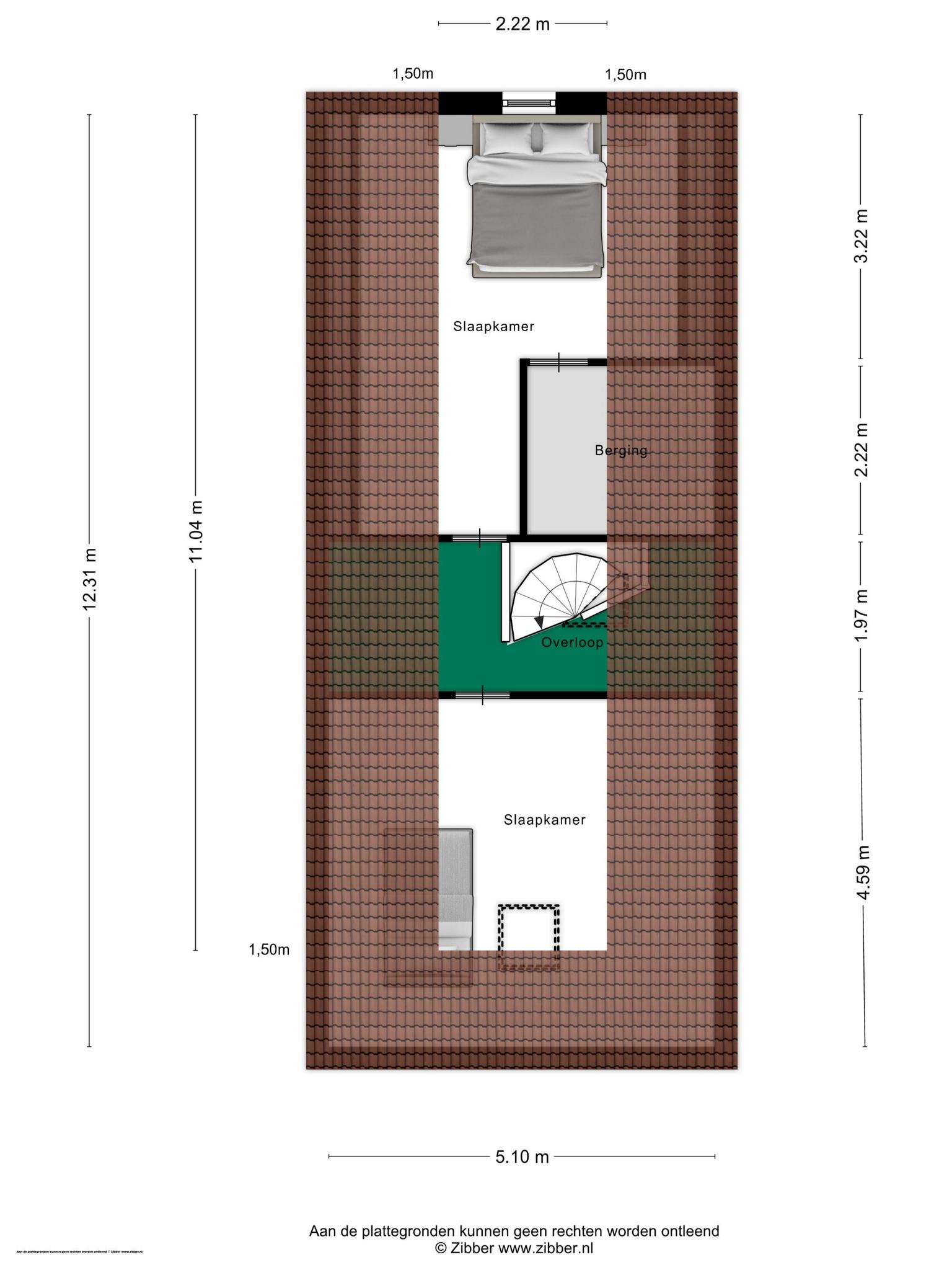 Aan de achterzijde is de hoofdslaapkamer met een gevelraam en een inpandige berging, die als kleedruimte gebruikt kan worden. De tweede slaapkamer, met een dakraam, bevindt zich aan de voorzijde.