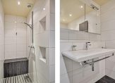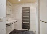 Gelijkvloers wonen is mogelijk dankzij de slaapkamer en badkamer op de begane grond. De moderne badkamer met fraaie wand- en vloertegels is ingedeeld met een inloopdouche, designradiator, een brede wastafel en een spiegelkast.