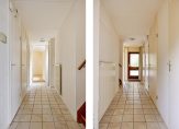 Vanaf de carport met lichtkoepel loop je naar de entree van deze lichte, goed ingedeelde woning. Aan de linkerzijde zijn een inpandige berging met vaste kasten en een wastafel, de meterkast, badkamer en de toiletruimte met fonteintje. De plavuizen vloer ligt niet alleen in de hal, maar ook in de woonkamer en keuken.