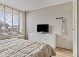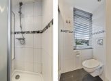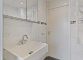 Wat voorheen een slaapkamer was, is verbouwd tot ruime badkamer. Je ziet mooie wand- en vloertegels, een verlaagd plafond met inbouwverlichting en het raam zorgt voor veel lichtinval. De ruimte is ingedeeld met een ligbad, aparte douche, tweede toilet en een wastafel. De spiegelkast en hoge wandkast bieden veel bergruimte.