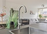 In de keuken staat een mooie, moderne opstelling uit 2018. Aan de kant van de woonkamer is het spoelgedeelte en tegen de andere muur het kookgedeelte. Brede lades en kasten bieden ruimte aan je keukenspullen en alle benodigde apparatuur is ingebouwd: een inductie kookplaat, afzuigkap, combi-oven, koelkast en een vaatwasser.