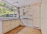 Aan de achterzijde is de dichte keuken, met fraai uitzicht naar de achtertuin en het achterliggende groen. De nette hoekopstelling is voorzien van een dubbele spoelbak, gaskookplaat, afzuigkap, koelkast en een vriezer. Aan de kant van de woonkamer is, heel handig, een tweedeurs inbouwkast voor servies of andere spullen.