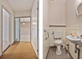 Bij de oprit is de overdekte entree van deze gelijkvloerse bungalow, die wordt gekenmerkt door de vele lichtinval. In de hal, aan de rechterzijde, zijn de toiletruimte met fonteintje en de vernieuwde badkamer. Deze ruimte is ingedeeld met een inloopdouche, wastafelmeubel, handdoekenradiator en een spiegelkast.