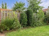 Deze leuke starterswoning heeft een voor- en achtertuin, waarbij de achtertuin op het zuidoosten gesitueerd is. Je ziet planten, bloemen, struiken, gras en lage bomen.