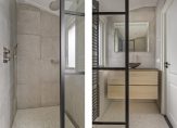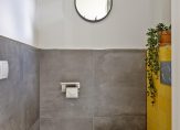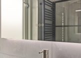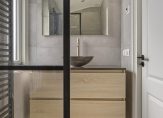 In 2019 is de badkamer geheel vernieuwd. Grote, grijze wandtegels zijn gecombineerd met modern sanitair, stijlvolle kranen en een terrazzo. Je hebt de beschikking over een ruime douche, een wastafelmeubel met twee lades, een spiegel met verlichting en een designradiator.