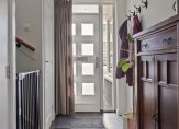 De entree is fraai, met de aangebouwde erker en overkapping voorzien van inbouwverlichting. In de hal zie je dat deze woning smaakvol is verbouwd, waardoor je al snel kan beginnen met inrichten. Aan de rechterzijde zijn de trapopgang, een verdiepte trapkast en de toiletruimte.
