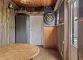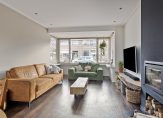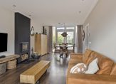 In de woonkamer is het zitgedeelte, dankzij de diepe erker, een stuk groter geworden. De muren en het plafond zijn strak afgewerkt, onder de pvc ligt vloerverwarming en de pui met openslaande deuren zorgt voor een mooie verbinding met de tuin. Tussen het zit- en het eetgedeelte bevindt zich de hoogrendement houtkachel, die voor een heerlijke warmte zorgt.