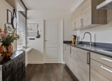 Vanuit de hal en woonkamer is de keuken te bereiken, waar een meer dan 4 meter lange wandopstelling (2013) staat. De houtlook van de keuken past goed bij het aanrechtblad en de achterwand bij het kookgedeelte. In 2021 is de inbouwapparatuur vernieuwd: een inductie kookplaat, afzuigkap, vaatwasser, koelkast en een combi-oven/magnetron.
