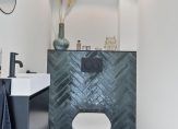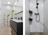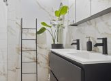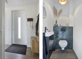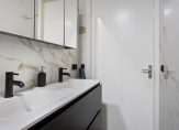 Zwarte kranen, marmerlook tegels en modern sanitair geven de badkamer een prachtige uitstraling. De L-vormige ruimte is ingedeeld met een inloopdouche, een dubbel wastafelmeubel en een spiegelkast. In de naastgelegen toiletruimte zie je een wandcloset, fonteinkastje, stucwerk en fraaie visgraat tegels.