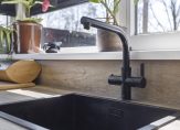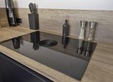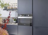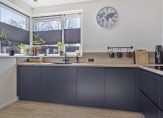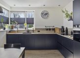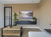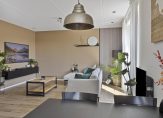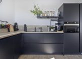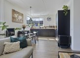 Met een oppervlakte van circa 32 m² is de woonkamer met open keuken een leefruimte van goed formaat, met openslaande tuindeuren bij het zitgedeelte en een groot hoekkozijn in de keuken. Warme kleuren en mooie materialen geven de woonkamer een aangename sfeer en bij de openslaande deuren is inbouwverlichting in het plafond geplaatst. In de keuken staat een royale, zwarte hoekopstelling met een houtlook blad en alle benodigde inbouwapparatuur: een inductie kookplaat met afzuiging, een vaatwasser, combi-oven en een koel-/vriescombinatie.