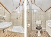 Er zijn twee slaapkamers op de eerste verdieping, die beiden van groot formaat zijn. Op de foto’s zijn de kamers leeg, maar de plattegronden geven goed weer dat er genoeg plek is voor een tweepersoonsbed, een bureau en een kledingkast. Verder zijn er een berging en een badkamer op deze verdieping. De badkamer is ingedeeld met een douche, wastafel en een toilet.