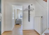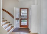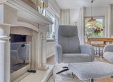 De hal is een grote, lichte ruimte met de trapopgang, meterkast en een nette laminaatvloer. Deze vloer ligt ook in de tuingerichte woonkamer, met grote ramen aan de zuid- en westkant. Het zitgedeelte is bij de open haard en het eetgedeelte biedt genoeg plek om een grote tafel neer te zetten. Wil je buiten zitten, dan loop je zo vanuit de woonkamer naar het zonnige terras.
