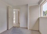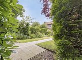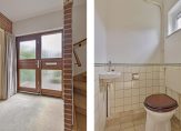 Deze woning heeft nog een echte tuin, met gevarieerde beplanting en mooie paarse bloemen. Via het brede pad loop je naar de entree, die toegang geeft tot de hal. Hier zie je direct dat deze woning niet in de lengterichting, maar in de breedte is gebouwd. Links in de hal zijn de trappen naar de eerste verdieping en de provisiekelder. De meterkast en de toiletruimte met fonteintje zijn aan de andere zijde van de hal.