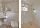 De vernieuwde badkamer, uitgevoerd in lichte kleuren, is ingedeeld met een ruime douchehoek, een toilet, handdoekenradiator, wastafel en een spiegelkast.