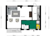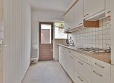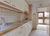 In de dichte keuken staat een lichte wandopstelling met een gaskookplaat, afzuigkap en een koelkast. Verwijder je de muur naar de woonkamer, dan ontstaat er optisch meer ruimte en is het mogelijk om een kookeiland te plaatsen.