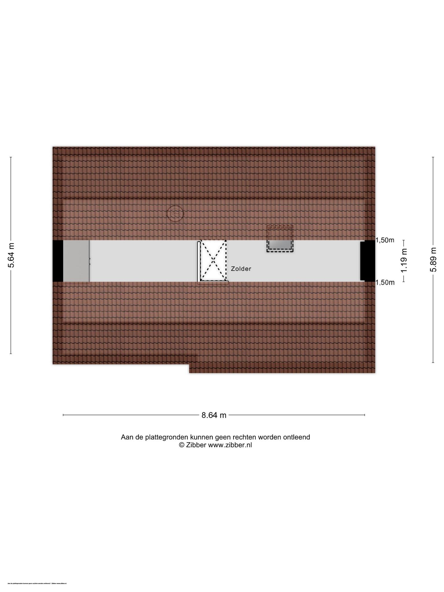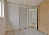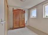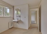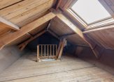 Achter het plafondluik op de overloop is een houten schuiftrap, die leidt naar de bergzolder. In het schuine dakvlak aan de achterzijde is een groot raam geplaatst en vlak naast de trap hangt een elektrische boiler voor warm water,