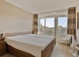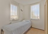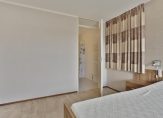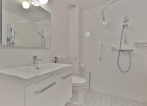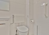 Dit fijne, gelijkvloerse appartement heeft twee slaapkamers, beiden met lichtinval aan twee zijden. De hoofdslaapkamer heeft, net als de woonkamer, een deur naar het balkon en prachtig uitzicht en grenst aan de badkamer. De badkamer, uitgevoerd in lichte kleuren, is ingedeeld met een douchehoek, tweede toilet, wastafelmeubel en de wasmachineaansluiting. Aan de andere zijde van het appartement is de tweede slaapkamer, waar een wastafel hangt.