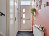 Via het pad in de voortuin bereik je de stijlvolle, recent vernieuwde voordeur. Zodra je binnenstapt, kom je in een royale hal die direct de warme sfeer van deze smaakvol gerenoveerde woning uitstraalt. Rechts in de hal bevinden zich de moderne toiletruimte met fonteintje, de meterkast en de trap naar de eerste verdieping.