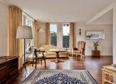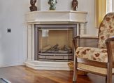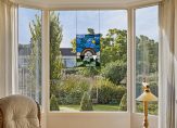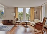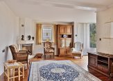 Aan de rechterzijde is de entree van de van deze verrassend ruime, vrijstaande woning. Op de vloer liggen grote, donkere tegels en onder de trap is een handige bergkast. De woonkamer heeft een mooie L-vorm, met een erker aan de voorzijde en aan drie kanten mooi uitzicht naar de tuin. Dankzij de ligging op het oosten, zuiden en westen valt de hele dag de zon naar binnen. Op de vloer ligt parket en in één van de hoeken staat een sierlijke schouw met een Faber gashaard.