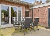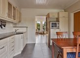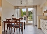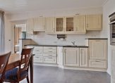 De dichte keuken heeft dezelfde vloer als de hal en openslaande tuindeuren naar de achtertuin. In de keuken is plek voor een eettafel en de lichte keukenopstelling in landelijke stijl biedt veel bergruimte. Alle apparatuur is ingebouwd: een keramische kookplaat, afzuigkap, vaatwasser (op hoogte), een combimagnetron en een koel-/vriescombinatie.