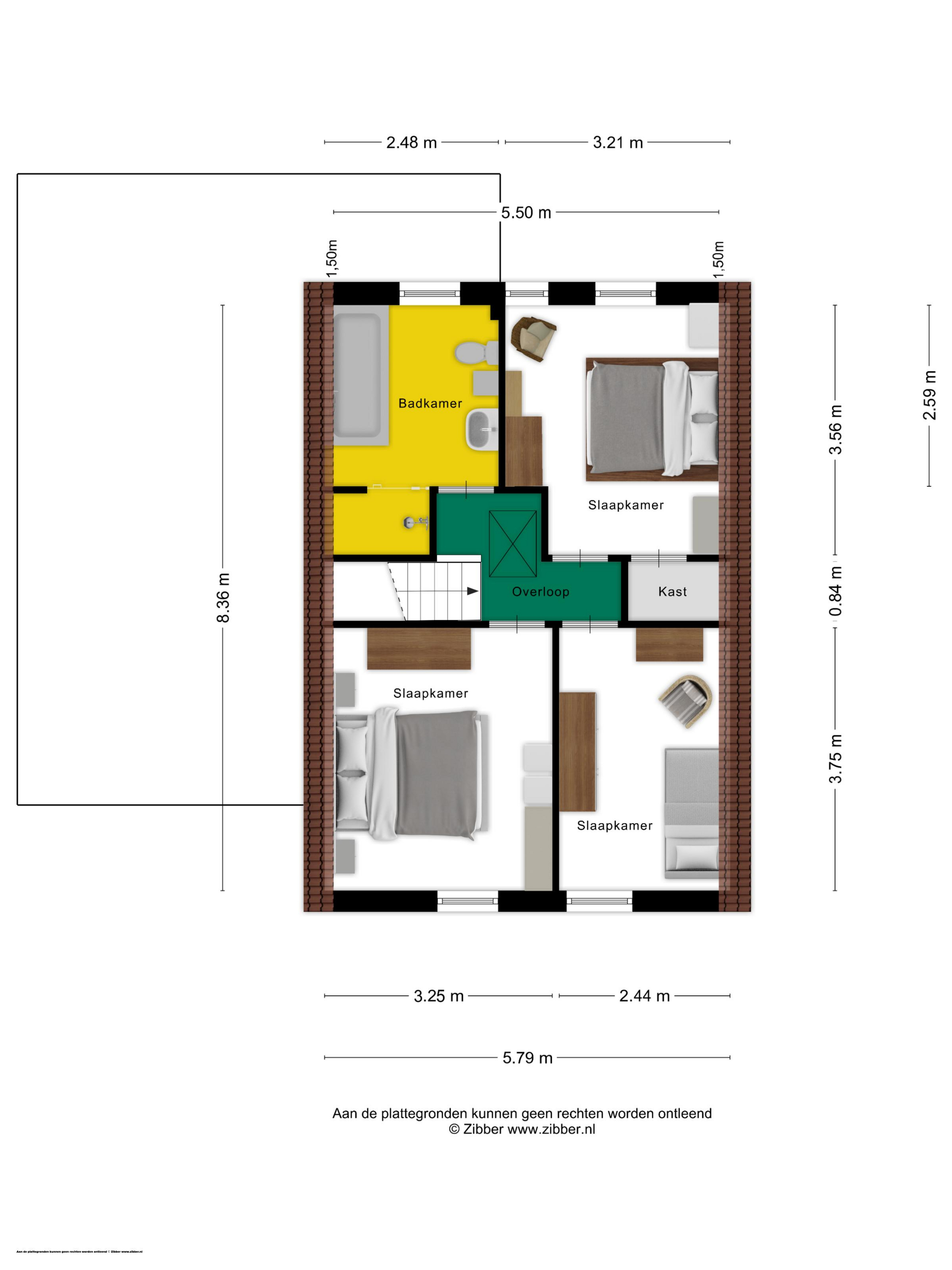 De hardhouten trap verbindt de hal met de overloop, waaraan drie slaapkamers en de badkamer grenzen. Op bijna de hele verdieping ligt tapijt op de vloer en het schuine dak begint op een fijne hoogte, waardoor de slaapkamer heel ruim zijn.