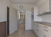 In de dichte keuken, te bereiken vanuit de hal en woonkamer, staat een circa 3.50 meter lange wandopstelling (2012) met een houtlook blad en diverse inbouwapparatuur: een kookplaat (circa 2018), afzuigkap en een combi-oven. Rechts van de spoelbak, onder het aanrechtblad, is plek voor een vaatwasser.