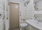 De originele badkamer, met een granitovloer en lichtgele wandtegels, is ingedeeld met een ruime douche, wastafel, handdoekenradiator en een toilet.
