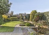 De voortuin met gevarieerde beplanting grenst aan de oprit en de carport, die tevens als eigen achterom fungeert. In de achtertuin, op het zuiden, zie je gras, borders met beplanting, een kleine vijver en een groot terras. In de tuin staan een houten berging en een stenen tuinhuis met overdekt terras.