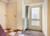 Aan de rechterzijde, naast het raam met de mooie luiken, is de overdekte entree van deze fors uitgebouwde woning. In de hal zijn de toiletruimte met fonteintje, de trapopgang en een bergkast met de meterkast.