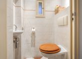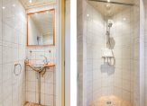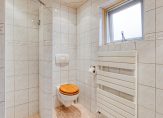 De badkamer heeft een raam in de zijgevel en de wanden zijn geheel betegeld in een lichte kleur. Dit zorgt ervoor dat de badkamer heel ruimtelijk oogt. Naast de inloopdouche is het toilet en aan de andere zijde, in een nis, hangt de wastafel.