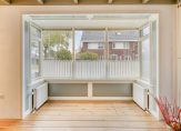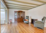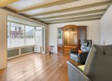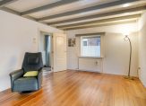 De woonkamer met erker is aan de voorzijde, met mooi uitzicht naar de rustige straat. Sfeermakers zijn de eikenhouten vloer, het balkenplafond en de panelen bij de erker. De woonkamer kan geheel als zitkamer worden ingedeeld, want de eettafel kan in de keuken staan.