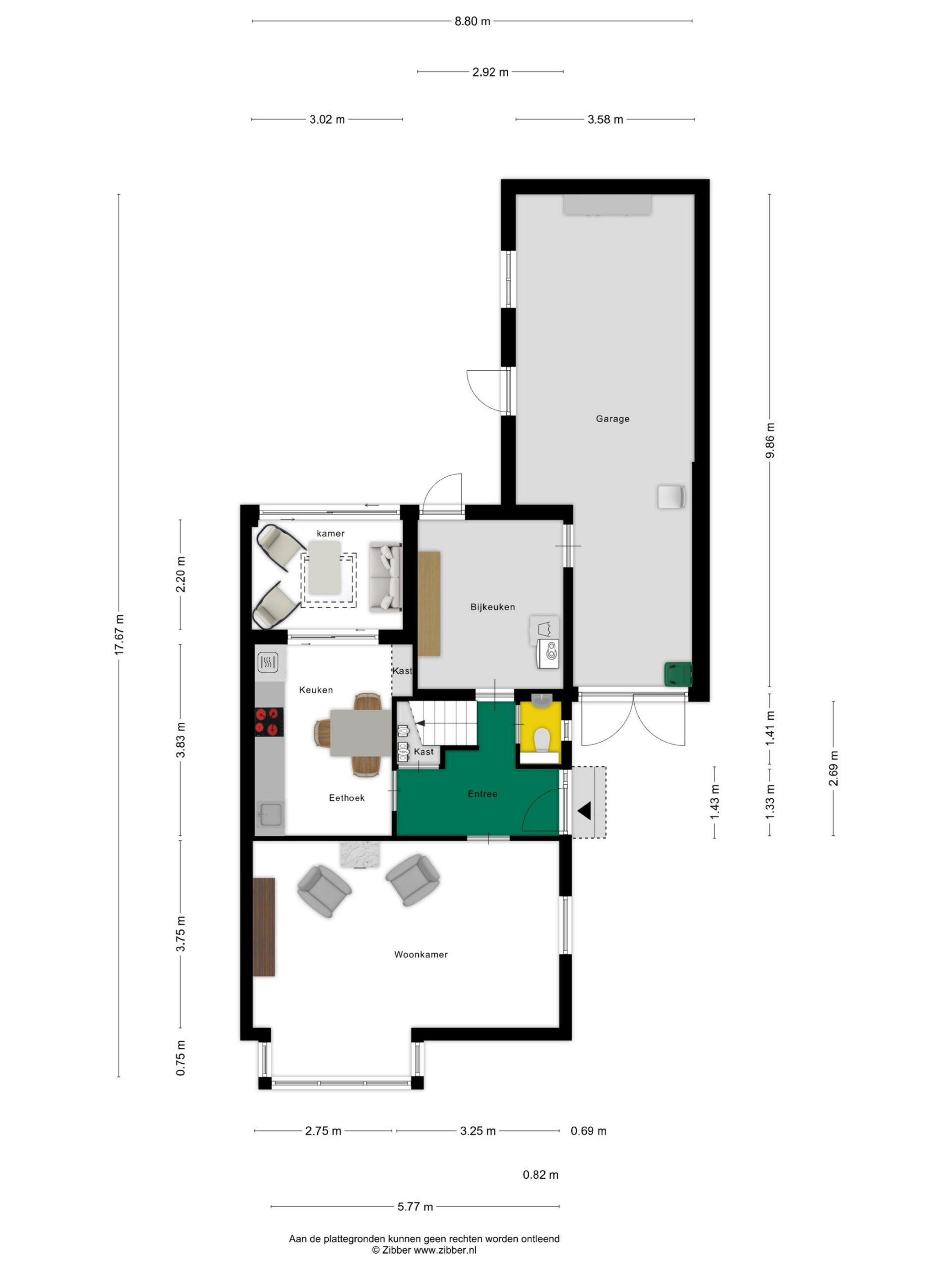 De inpandig te bereiken garage/hobbyruimte heeft een lengte van bijna 10 meter, perfect voor de hobbyist en als opslag. Openslaande deuren aan de voorzijde geven toegang tot de oprit en in het achterste deel is een deur naar de tuin. De garage is voorzien van verwarming, elektra, verlichting en een tegelvloer.