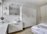 Er zijn maar liefst drie slaapkamers, één aan de voorzijde en twee aan de achterzijde. Eén kamer aan de achterzijde is de master bedroom met een maatwerk kastenwand, wastafelmeubel en een spiegelkast. Een van de slaapkamers, ingericht als werk-/studeerkamer, heeft mooi uitzicht naar de voortuin en vanuit de logeerkamer kijkt u eveneens naar de achtertuin.