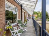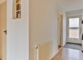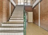 Tussen de kapsalon en Buurtzorg is de centrale entree met de brievenbussen, intercom en het bellentableau aan de buitenzijde. Op de begane grond zijn twee privébergingen van totaal ca. 9.1 m2. Een brede trap leidt naar de overdekte galerij op de eerste verdieping, waar de voordeur van het appartement is. Op de galerij is het mogelijk om een stoel neer te zetten, waar je heerlijk in de ochtendzon kan zitten.