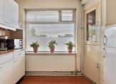 In de ruime, dichte keuken staat een lichte wandopstelling met een ingebouwde gaskookplaat en een afzuigkap. De originele provisiekast en servieskast zijn behouden, net als de wandtegels.