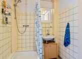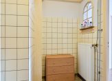 Ook de toiletruimte met fonteintje en de badkamer zijn vanuit de hal te bereiken. In de badkamer zijn de originele granitovloer en wandtegels behouden. De ruimte is ingedeeld met een douche en wastafel. Met een andere indeling is het mogelijk om een ligbad te plaatsen.