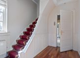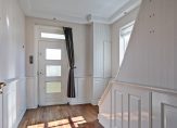 We gaan naar de hal waar de trap met loper, de witte lambrisering en de parketvloer de sfeer bepalen. Dankzij het hoge plafond en de lichtinval oogt de hal heel ruimtelijk. De aansluitende woonkamer staat in verbinding met een riante eetkamer en een zit-/werkkamer. Met een totale oppervlakte van ruim 60 m2 heb je de beschikking over een grote hoeveelheid leefruimte, klaar voor een nieuwe invulling. Grote ramen en openslaande deuren zorgen voor een uitstekende verbinding met de tuin.