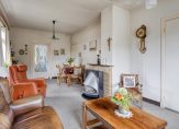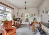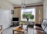 Vanuit de hal zijn de woonkamer en een slaap-/werkkamer te bereiken. De woonkamer, met grote ramen aan twee zijden, heeft een lengte van bijna 7.50 meter. Het zitgedeelte is nu aan de voorzijde en het eetgedeelte aan de achterzijde van de woonkamer.