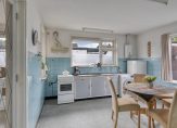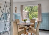 Je oog valt op een deur met een groot glas-in loodraam. Achter deze deur is de ruime eetkeuken, met klassieke blauwe wandtegels en een retro-keukenblok. De apparatuur is los geplaatst, en in de hoek hangt een geiser die voor warm water zorgt.