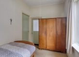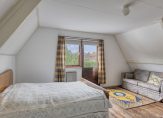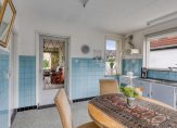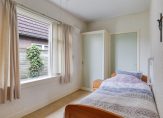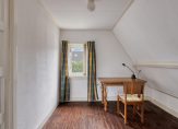 Naast de keuken is een ruime bijkeuken, die samen met de keuken de mogelijkheid biedt om een woonkeuken te realiseren. De badkamer, net als de keuken met blauwe tegels, is ingedeeld met een toilet, wastafel en een douche. In de slaapkamer, met een inbouwkast, staan nu een eenpersoonsbed en een grote garderobekast. Ga je boven slapen, dan is deze kamer onder andere geschikt als werkkamer, speelkamer of eetkamer.