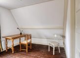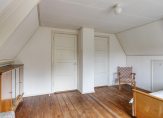 Vanaf de ruime overloop, met een berging achter het gordijn, zijn twee slaapkamers te bereiken. Aan de achterzijde is de grootste slaapkamer, met een deur naar het platte dak. De kamer aan de voorzijde, waar nu een bureau staat, is qua ruimte heel geschikt als kinderkamer. De paneeldeuren zijn behouden, en je ziet de originele houten vloer.