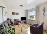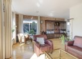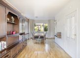 Een mooie deur met glas verbindt de hal met de woonkamer, waar een parketvloer ligt. Het zitgedeelte heeft een breedte van bijna 6.50 meter, met mooi uitzicht naar de voortuin en de brede straat. Ook is er in de woonkamer plek voor een groot wandmeubel of een dressoir, en het eetgedeelte grenst net als de keuken aan de achtertuin.