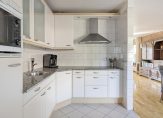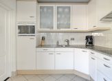 In de keuken ligt een tegelvloer, die qua kleur goed past bij de wandtegels en de keukenopstelling die rond 2005 is geplaatst. Het aanrechtblad is uitgevoerd in een granietlook en de keramische kookplaat, afzuigkap, koelkast en combimagnetron zijn ingebouwd.
