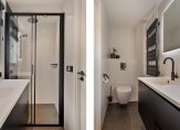 De badkamer, met raam in de zijgevel, is een fantastische ruimte met de juiste looks en veel comfort. Je oog vat op het grote wastafelmeubel met spiegel, de zwarte kranen, designradiator, het wandcloset en de ruime inloopdouche met regendouche.