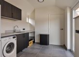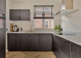 Tijdens de verbouwing is de muur tussen de woonkamer en keuken verwijderd, waardoor de keuken veel beter te gebruiken is. Je oog valt op de moderne hoekopstelling en de hoge kastenwand, die beiden veel bergruimte bieden. Alle benodigde apparatuur is ingebouwd: een inductie kookplaat, afzuigkap, vaatwasser, combi-oven en een koelkast. In de aanbouw is de ruime, goed afgewerkte bijkeuken met een aanrechtblad, spoelbak, boven-/onderkasten en de wasmachineaansluiting.