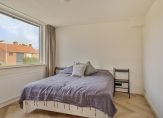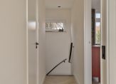 In de hal ligt, net als in de woonkamer en keuken, een mooie visgraat pvc-vloer met vloerverwarming. De woonkamer is een sfeervolle leefruimte met mooi uitzicht naar de voor- en achtertuin en de rustige straat. Mooie elementen zijn het stucwerk, de inbouwverlichting en de openslaande deuren naar de tuin.